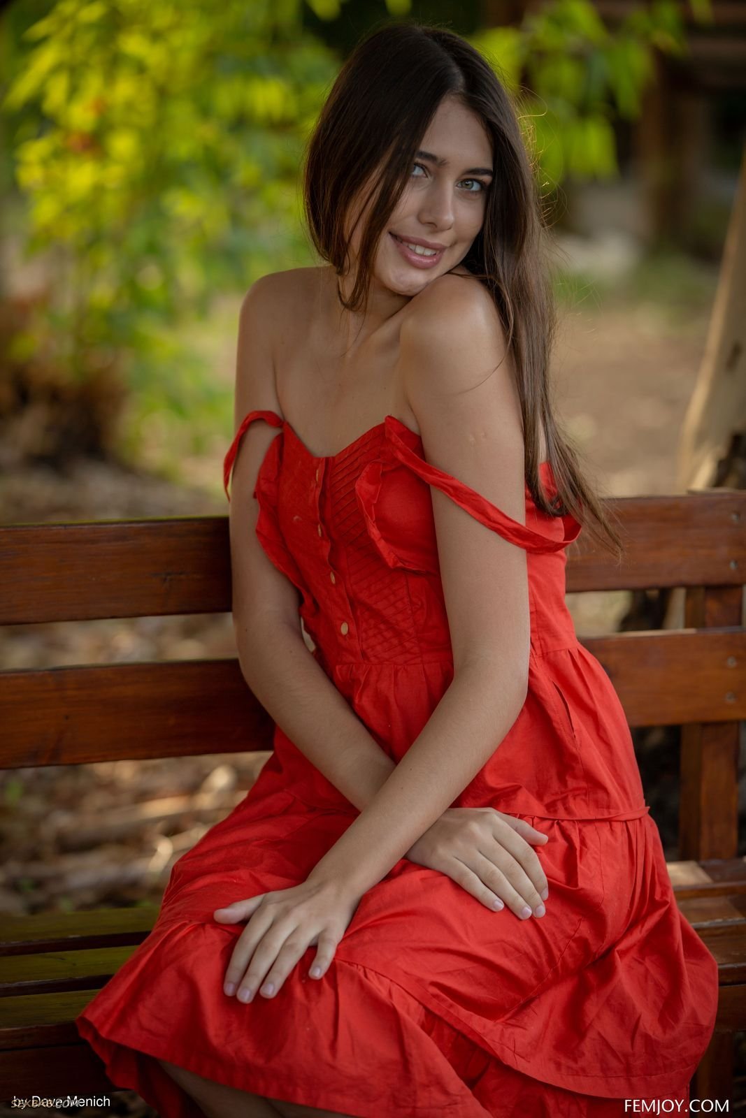 Описание: Развратная девушка в красном платье медленно оголила свое стройное молодое тело, соблазнительно скинув с себя всю одежду. Сидя на большой деревянной лавке в парке, бесстыжая девица с маленькими титьками возбуждающе позирует перед камерой, чувственно изгибаясь в разных эротических позах и игриво засвечивая свою бритую нежную киску.