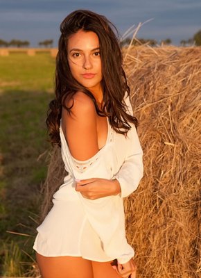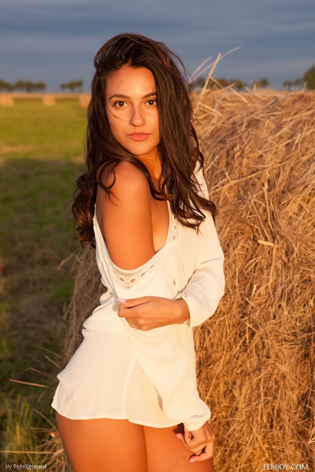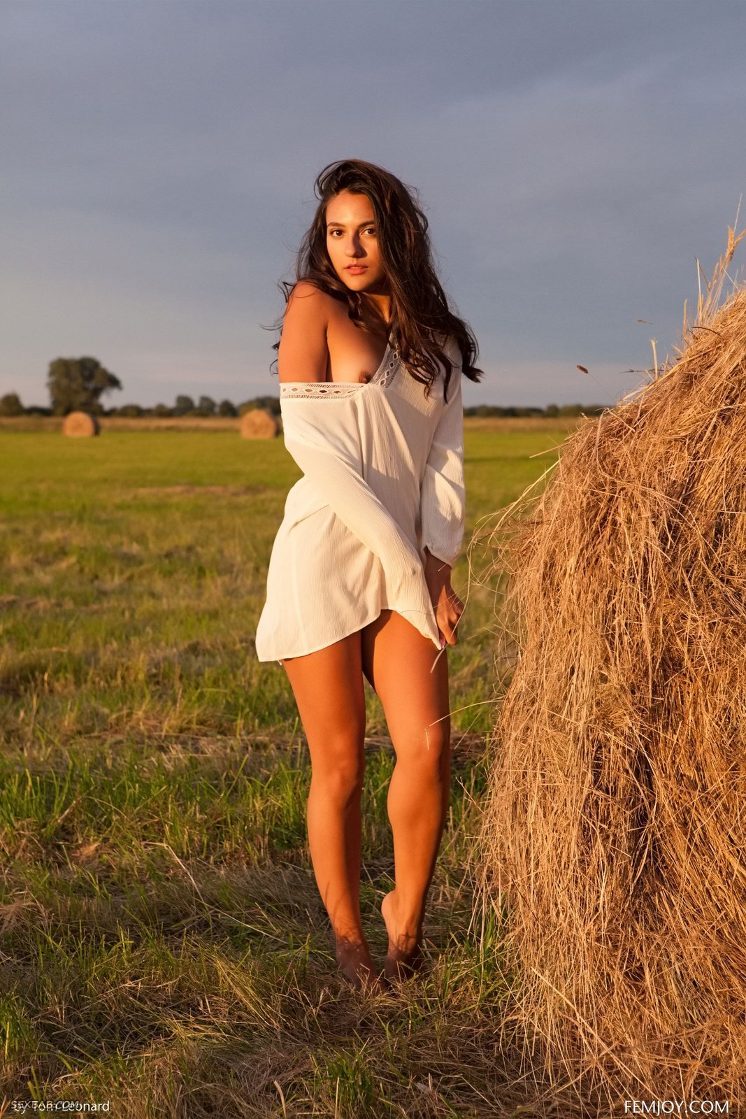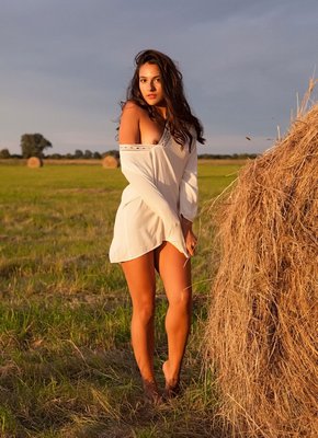 Описание: Надев белое платье без нижнего белья, молодая брюнетка со стройной фигурой начинает эротично позировать и даже раздеваться посреди деревенского поля, удобно расположившись на стоге сена. Раздвигая промежность и прогибаясь раком, сексуальная девушка с маленькими сиськами показывала крупным планом гладко выбритую письку, не запрещая полюбоваться и её упругой попкой.