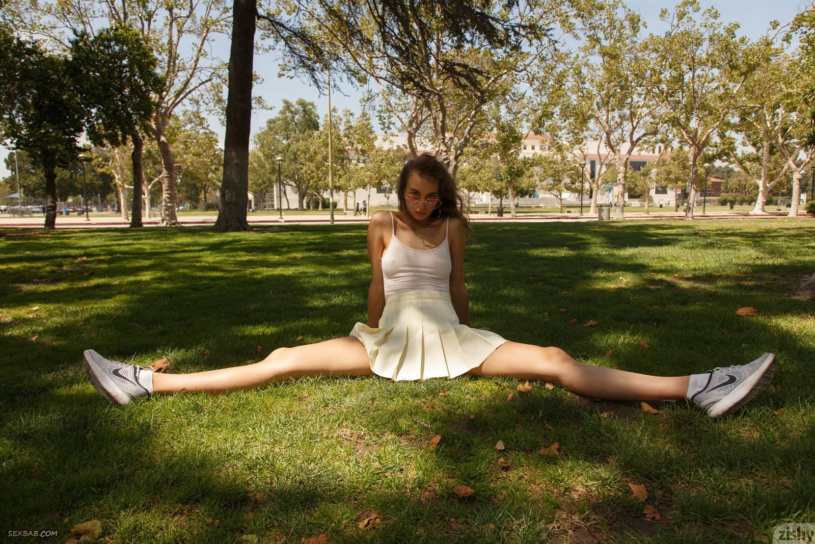 Описание: Прогуливаясь жарким днем на улице, симпатичная проказница в коротком платье и очках в каике-то моменты эротично позирует и засвечивает белые трусы и попку под юбкой. Ощутив возбуждение и расположившись на газоне, сексуальная молодая девушка так же демонстрировала упругие сиськи.
