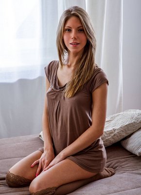 Описание: Лежа на большой мягкой постели, молодая русая красавица медленно сняла с себя короткое платье и трусики на камеру, чувственно поглаживая себя по голым участкам своего чувствительного тела. Соблазнительная детка в игривых чулочках показала нам свои маленькие аккуратные титечки и бритую письку.