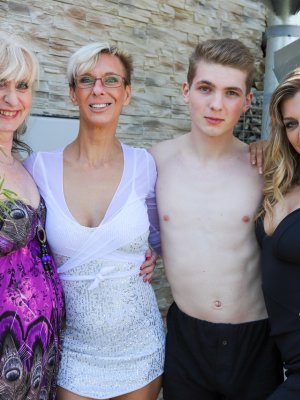 Описание: Развлекаясь на заднем дворе со своими секс игрушками, трио зрелых лесбиянок стонали от наслаждения. Барышни так громко кричали от ебли со страпоном, что на их стоны пришел любопытный сосед. Возбужденные милфы тут же набросились на член парня. Опытные женщины сосали счастливчику хуй и раздвигали перед ним ножки, чтобы насладиться групповым сексом за домом.
